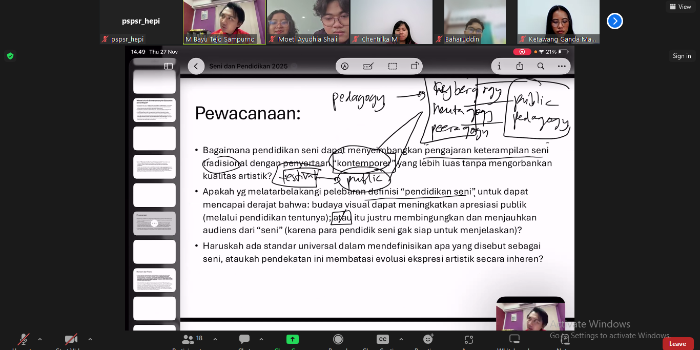In his presentation, Bayu Tejo Sampurno emphasized the importance of understanding the current development of art and education, including how educators must cultivate engagement and relevance in their teaching approaches. Creativity-based and student-centered pedagogical strategies were highlighted as key components in effective arts education.